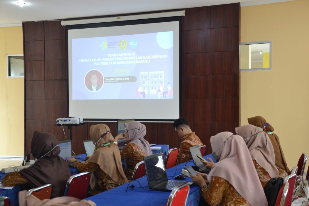 Kegiatan Pendampingan Re-Akreditasi Perpustakaan Poltekkes Kemenkes Bengkulu dilaksanakan pada Hari Selasa Tanggal 30 Agustus 2022 dengan Narasumber dari Dinas Perpustakaan dan Kearsipan Propinsi Bengkulu yaitu Bapak Tony Hartanto, S. Sos. Acara Pembukaan dimulai pada pukul 10.00 WIB s.d 10.30 WIB bertempat di Aula Lantai 3 Direktorat Poltekkes Kemenkes Bengkulu di lanjutkan Kegiatan Pendampingan Re-Akreditasi Perpustakaan bertempat di Gedung Perpustakaan Poltekkes Kemenkes Bengkulu.